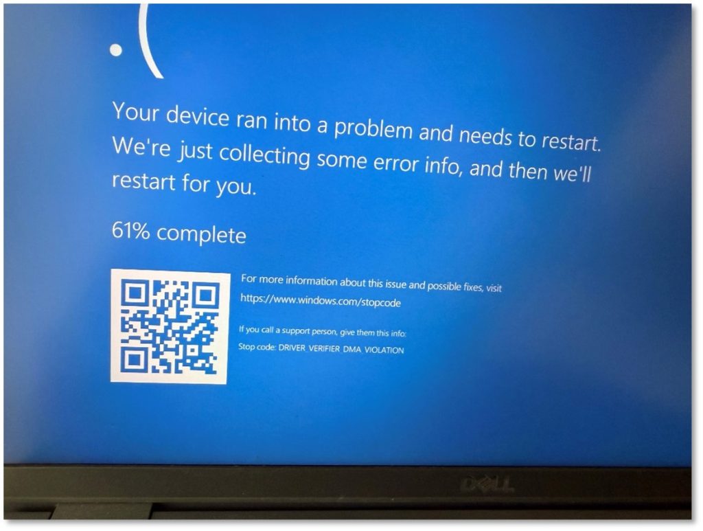 With ‘Kernel DMA Protection’ enabled, DMA attempts will result in the operating system freezing or crashing before compromise can occur. This is illustrated by the following photo where a DMA attack failed on a laptop with ‘Kernel DMA Protection’ set to ‘On’. (Note the ‘DRIVER_VERIFIER_DMA_VIOLATION’ BSOD stop code shown in the picture.)